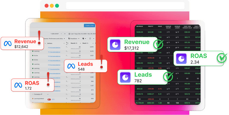 See true ROAS, net profit, and customer journeys in one clean dashboard so you scale what works and stop wasting budget.